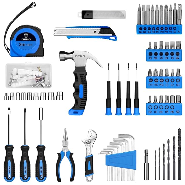 DEKO【8V電動ドリル付き】126点組 工具セット ホームツールセット 家庭用 ツールセット 日曜大工 DIYセット 作業工具セット 家具の組み立て 住まいのメンテナンス用 修理道具セット 便利な収納ケース付き (ブル-)