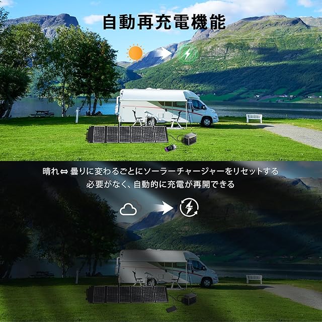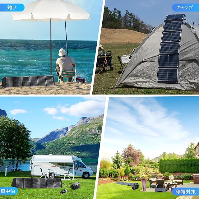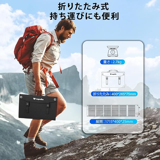 【折りたたみ式、持ち運びにも便利】ソーラーチャージャーはコンパクトサイズに折り畳むことができます。持ち運びが楽で、移動中に破損しにくいです。折り畳み時のサイズは約400*265*75mm、展開時約1715*400*25mm、2.7kgの軽量で、キャンプ、お釣り、車中泊などのアウトドア活動や、防災用具としておすすめです。 ポータブルな構造を採用したことにより距離旅行や登山、 ハイキング、BBQなどのアウトドアに最適なつくりとなっております。地震 ・ 災害時にも非常用電源としても大活躍です。