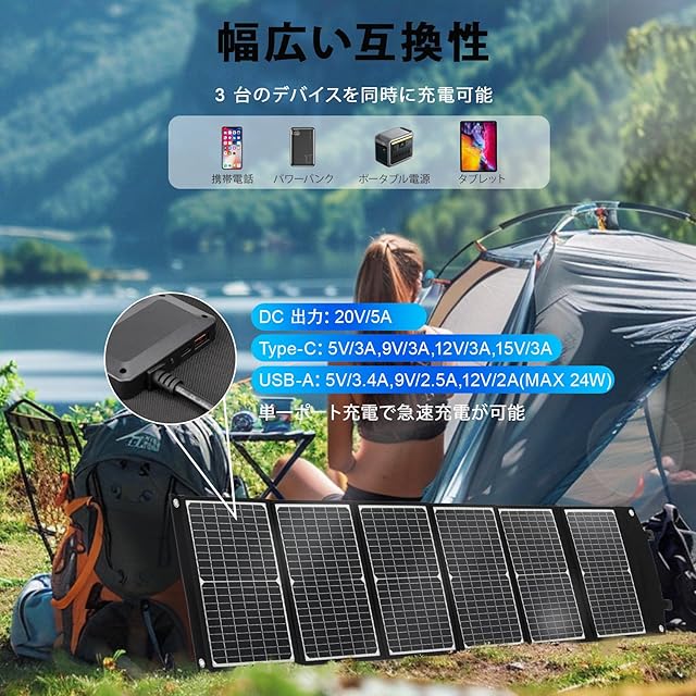 【高転換効率&急速充電PD45W】ソーラーパネルは高品質パネルセルを利用し、最大24%発電転換効率を実現します。USBはPD45W、QC3.0の規格に対応しているので、最大45Wの出力で急速充電できます。※単一ポート充電で急速充電が可能で、受電側の機器が急速充電の規格に対応している必要があります。3 台のデバイスを同時に充電可能ですが、急速充電ではありません。QC3.0、QC2.0、FCP、AFC、DCP-1.5A、APPLE2.4A などをサポートします。