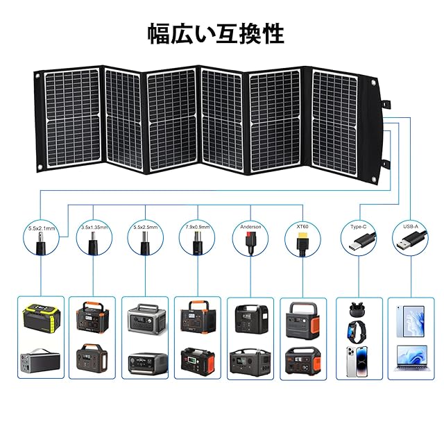 【超高互換性、ポータブル電源に最適】100Wソーラー充電器は、DC5521ケーブルが付いている、DC5521 to 30A Anderson/XT60 ケーブル、3つのDCコネクタ(35135/5525/7909)も付属しています。ほとんどのポータブル電源に対応できます。(Jackery/Bluetti/Anker/EcoFlowなどに対応できる)またポータブル電源のほか、ほとんどの(USB出力対応)スマホ、ノートパソコン、ラップトップ、携帯用電源に活躍しています。(ポータブル電源の最大入力仕様を必ずご確認ください。)(※発電量は、実際の日射や設置場所などの環境により大きく変化するので、使用中、太陽電池パネルを太陽に向かって最適な角度に調整すると、より良い性能を発揮します。)