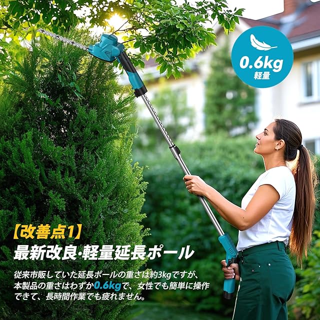 【革新的な軽量ポール、あなたの庭仕事を革命化!】市販されていた延長ポールは約 3kg でしたが、当社新製品はわずか 0.6kgに軽量化。女性でも高枝切りが気軽にできます。ポールヘッジトリマーは無段階で100cm~150cmまで伸び、身長に合わせ最大 250cm の作業範囲を実現。高い木の刈り込みや枝払いも楽に。さらに作業環境に合わせ 5 段階のヘッド角度調整機能搭載。ヘッドは下向き・上向きにそれぞれ 45° まで 5 段階で固定できます。高所や奥行きの手の届きにくい生垣の剪定はもちろん、下草も立ったまま刈れるので、作業効率がアップし作業負担も軽減。快適な庭仕事をサポートします。