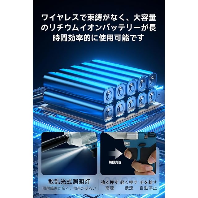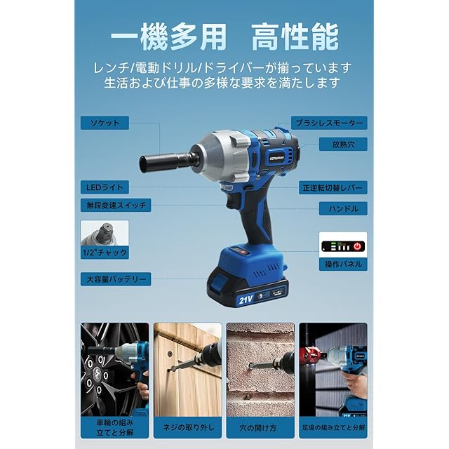 【多用途のアクセサリーと多機能】無電線電動インパクトレンチは、多用途のアクセサリーを搭載しており、自動車の修理に適した各種ヘッドなど、様々な専用アタッチメントを備えています。これにより、締め付けや解体作業のみならず、複雑な組み立て作業も容易に行えます。追加の工具を必要とせず、ユーザーに大きな利便性と効率を提供します。
