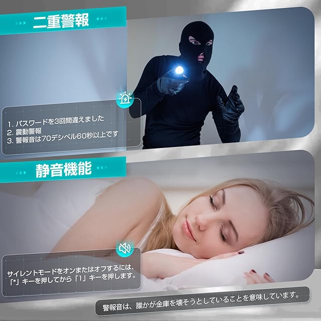 【二重警報システム搭載】当金庫は70dBの大音量警報と消音モードを搭載。誤入力3回連続または衝撃を感知すると自動的に警報が作動し、空き巣を威嚇。一方、ワンタッチで消音モードに切り替え可能なため、深夜やお子様がいるご家庭でも安心してお使いいただけます。防犯性能と生活環境への配慮を両立した「賢い」セキュリティ設計です。
