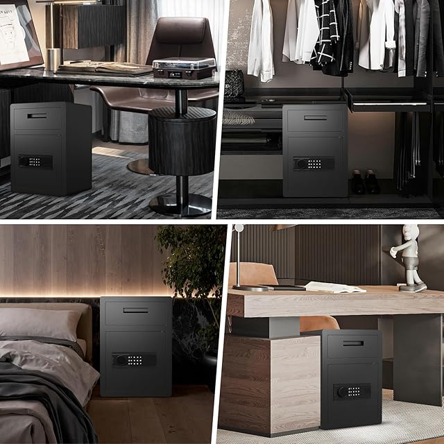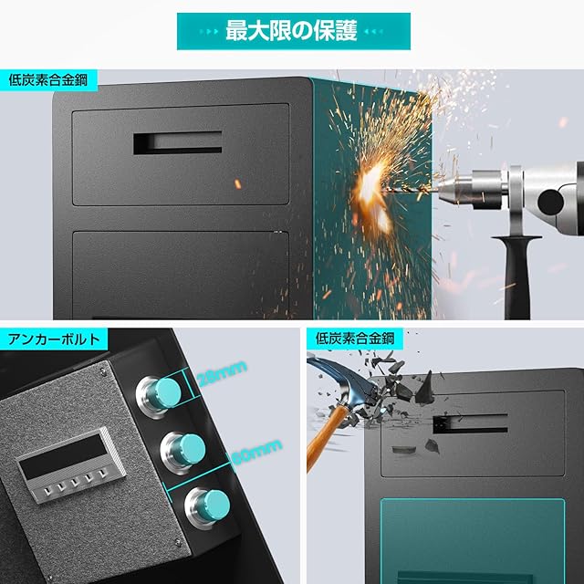 【重厚な金庫構造】安心の防犯用金庫は、低炭素合金鋼構造を採用しており、耐久性と堅牢性を兼ね備えています。3×28mmのソリッドロックボルトと60mmの厚さを誇る鉄筋ドアプレートを備え、先進的なマイクロクリアカットデザインによって、シームレスな統合と優れたピッキング保護を実現しています。この大型預かり金庫は、現金や領収書、預金証書、鍵などの貴重品を守るための強力な盗難防止機能を提供します。家庭用金庫を選ぶ際には、この重厚な構造を検討してみてください。