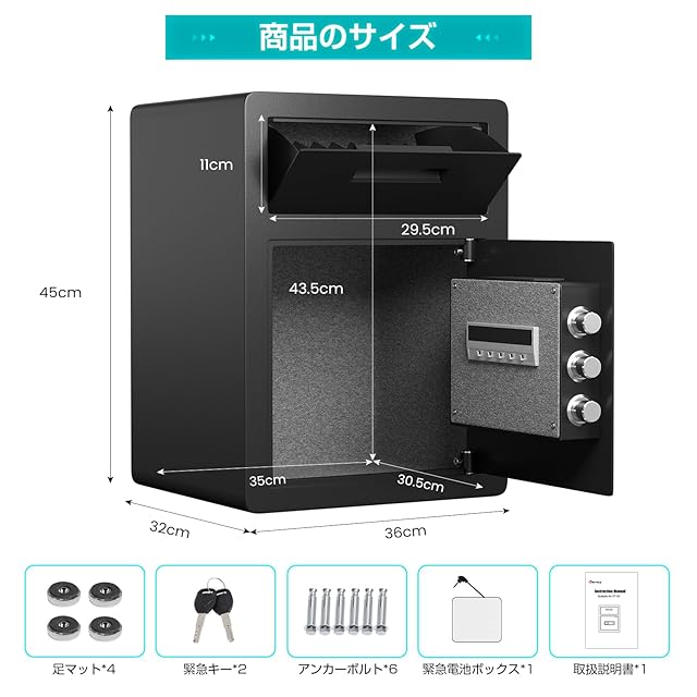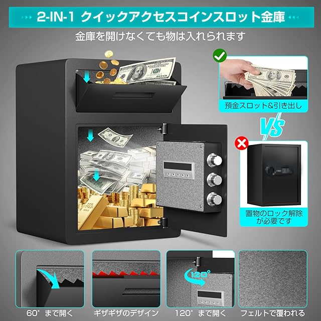 VIAWELL 金庫 家庭用 45L 2 in1スロットビジネス 小型 電子金庫 防犯箱 耐火 テンキー式 店舗用 業務用 会社用 貯金箱 ライト ダブルアラーム機能 緊急キーでロック解除 LED ライトとミュート機能 現金 ジュエリー 貴重品 保管庫 床・壁に固定可能 事務所 家庭 旅館 店に適し 日本語取扱説明書付き