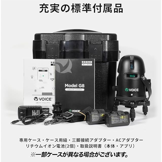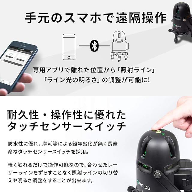✅【シリーズ累計 96,000台突破!】VOICE レーザー墨出し器から、デザインと機能をアップグレードしたモデルが登場。マットブラックを基調としたスタイリッシュなデザイン。専用アプリを使うことで、手元のスマートフォンから「照射ライン」や「ラインの明るさ」の調整が可能に。