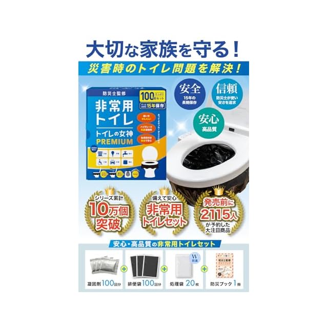 どこでも簡単トイレ トイレの女神PREMIUM 簡易トイレ 【防災士が監修】 15年保存&日本製 携帯/防災/非常用トイレ 防災グッズ 防災ガイドブック付き (100回)