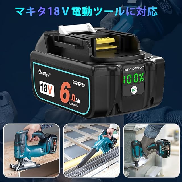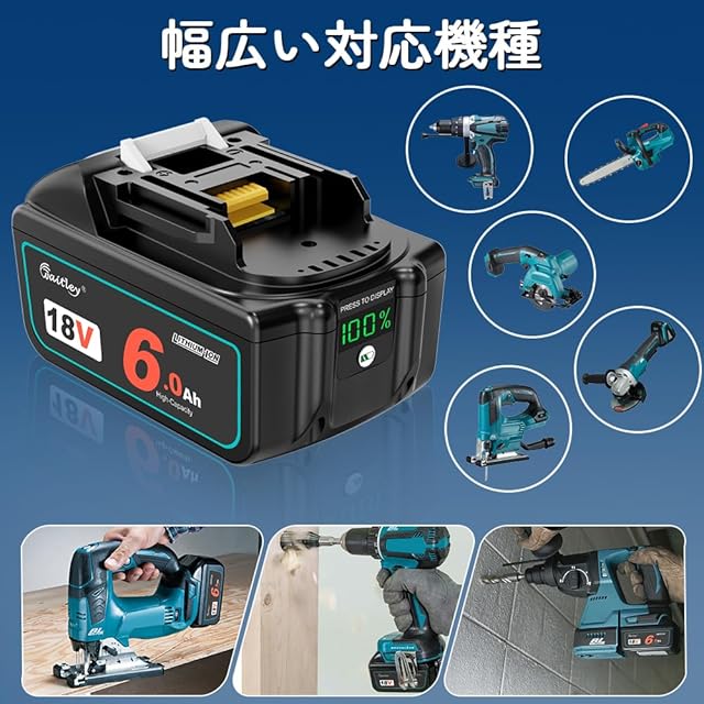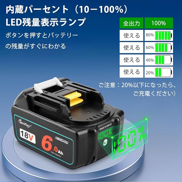 【デザインメリット】マキタ18v 互換バッテリー 6.0Ah バッテリー 種類:リチウムイオン電池(Li-ion)。容量:6000mAh。連続使用時間は従来のBL1830より2倍アップ。BL1860BバッテリーはLED数字残量表示付き:ボタンを押し、数字表示の残量%が見えます。バッテリーはどのくらい容量があるか一見だけで分かって安心します