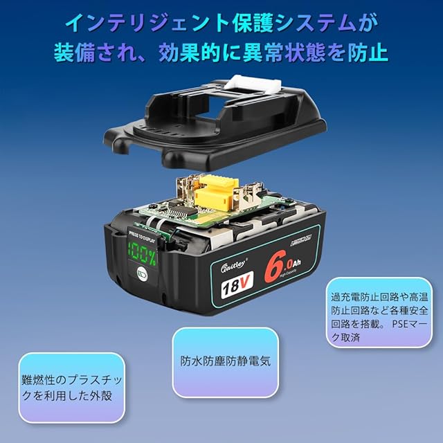 【安全性】高品質セル搭載で、耐久性が高く、長期間使用可能です。保護回路も内蔵しているので、安心してご使用頂けます。(ご注意:バッテリーを保護するために、充電が完了したら、バッテリーに悪影響を与えないように充電器からバッテリーを取り外してください。バッテリーを使用完了後、電動工具から取り外してください。電動工具に付けたままにしないでください)