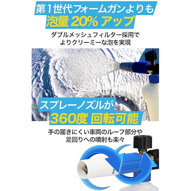 ✅【泡性能を最大限に引き出すためにご確認ください】 ●MJJC純正のフォームガン専用シャンプー【神泡】がおすすめです。●シャンプーの性能により泡立ち具合は変わります。(泡だちの悪いシャンプーもあります。)●MJJC純正のシャンプーを使用しても泡が出ない場合は、以下の内容を見直して下さい。 ・1.1mmまたは1.25mmのノズルがしっかり本体に取り付けられていますか? ・本体に吸引チューブは取り付けられていますか? ・泡量の調節ダイヤルが最小になっていませんか? ・高圧洗浄機は正常に機能していますか? 高圧洗浄機本体の推奨圧力性能は90Bar(9MPa)以上です。この数値を下回る高圧洗浄機でご使用の場合は、付属の1.1mmノズルに交換することにより、最適な泡の状態に近づけることができます。