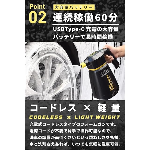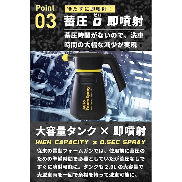 ✅【 洗車の助っ人 自動泡噴霧器 】新型の充電式コードレスタイプフォームガン!蓄圧なしで即噴射することができるので洗車時間を大幅に短縮することができます。✅【 モコモコ泡で洗車 】きめ細かい泡立ち噴射でボディを包み込むため洗車傷の発生を抑えることができます。