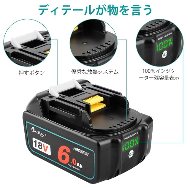 【独特の残量表示付き】100%の数字表示の電量表示付き、ボタンを押すと、数字表示の残量%が見える、一目でバッテリー容量が分かり易いです。安心高品質セル採用、容量アップで6.0Ahの高容量、長時間作業可能。自然放電が少なく長持ち、安定性が良い。