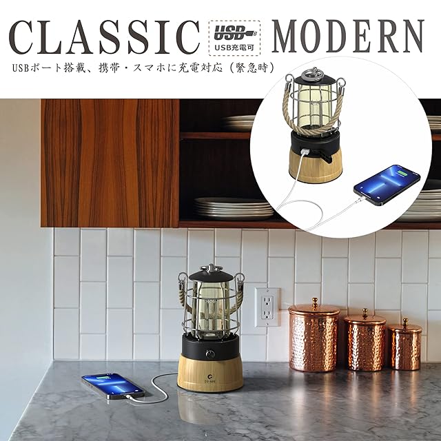 【便利なUSB充電・モバイルバッテリー機能付き】充電式バッテリーを搭載しており、付属のType-C USB充電ケーブルで簡単に充電可能ですので、基本的に電池交換をする必要はありません。 また、モバイルバッテリーとしても機能し、USB出力ポートを経由してお使いのスマホやタブレットなどの充電式機器を充電することが可能ですので、「もしも」の時に大変役立ちます。 さらに、大容量充電池1本付属の充電式ランタンですが、乾電池(別売り)も使用できます。生活の便利さを向上する上に、停電・防災時にも備えることができます。くつろぎのひと時に彩りを添えて、疲れた心身を癒します。