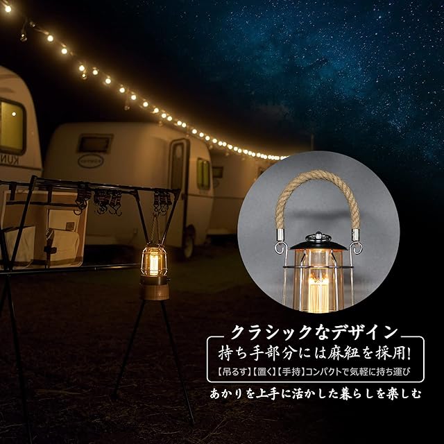 【いろいろなシーンで大活躍】キャンプ、バーベキュー、パーティー、車中泊、小旅行、アウトドアに最適のデザインで、快適にご利用になれます。 クラシックの上に、発光色は電球色で、玄関・家庭・店舗などの雰囲気作りの為の装飾用品として、大いに役立ちます。 連続点灯時間は最長80H点灯できますので、停電や災害時の非常灯として安心しして打出来ることで心を癒します。また、寝室・夜間授乳などもオススメです。 長時間点灯できますので、店舗や飲食店の間接照明としてもオススメです。