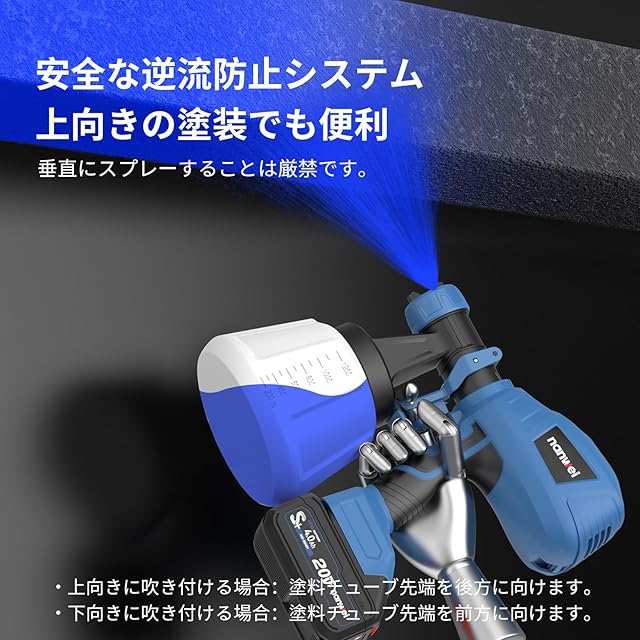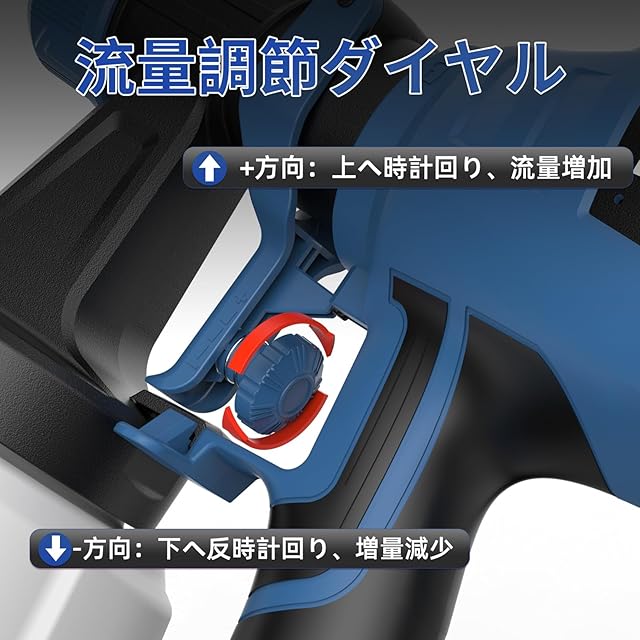 【流量調節ダイヤル&逆流防止システム】上へ時計回り、流量が増加します。下へ反時計回り、流量が減少します。電動スプレーガンは流量調節できて、作業シーンに応じて塗装作業を進めることができます。上向きの塗装でもこのペイントスプレーガンができます。垂直にスプレーすることは厳禁です。