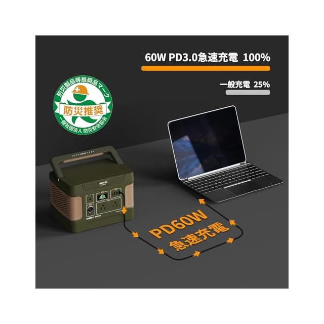 【PD 60w急速充電技術】USBはデュアルPD60W出力に対応しているため、ノートPCも急速充電することができます。EEIVOLポータブル電源独自の充電技術で、デュアルポート(DCポート、USB-C PDポート)をサポートし、シングルポートでの同時充電の2倍の速度で大容量バッテリーを充電することが可能です。2.8時間で80%までフル充電が可能で、充電効率が大幅に向上しています。 ※注意:PD60Wを使用してEEIVOLポータブル電源を充電するには、PD対応アダプターとケーブル(別途ご購入)が必要です。