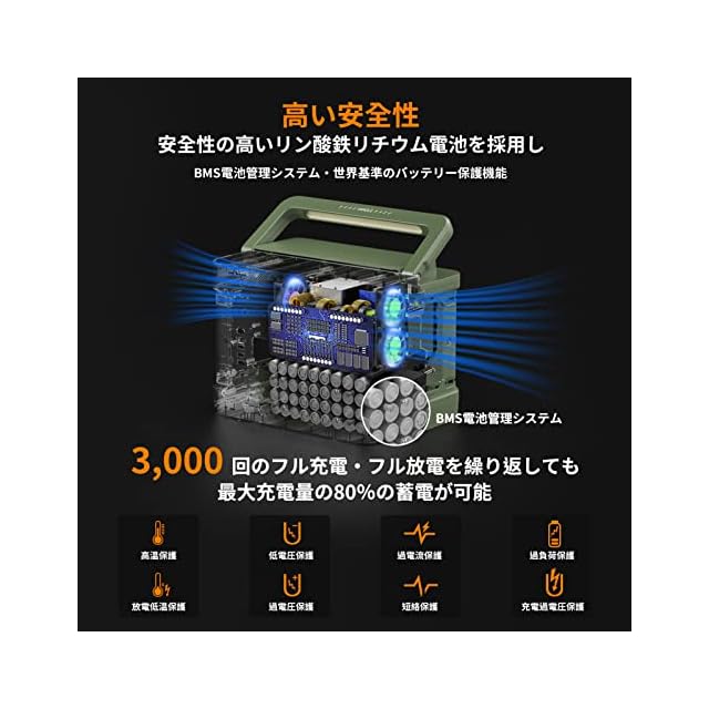 【高安全性と安心できるアフターサービス】 PSEやUN38.3などの必要な認可を取得し、安全性の高いリチウム電池を使用し、電池のエネルギー効率を最適化しながら長寿命化を実現しました。また、BMS(電池管理システム)により電圧や温度を正しく管理し、過充電や過放電を防止して安全性を高めています。購入後も安心できるアフターサービス:24ヶ月長期保証+無期限のカスタマーサポート。何かご質問やご意見などがございましたら、いつでもお気軽にカスタマーサービスへお問い合わせください。