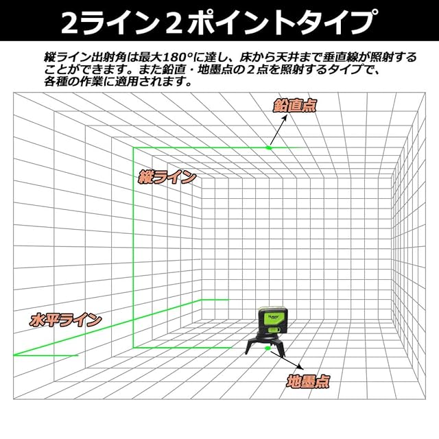 Huepar 2ライン グリーン レーザー墨出し器 2ポイント 緑色 クロスラインレーザー 自動水平調整機能 高輝度 ライン出射角110°&180° 地墨 鉛直ポイント 2線2点 9211CG