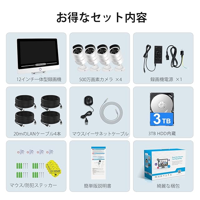 【最新500万画素】 防犯カメラ 屋外 POE給電 3K 12型防犯モニター 3テラHDD AI人物検知 防犯灯発光 フルカラー暗視撮影 双方向通話 8台増設 YESKAMOO 監視カメラ 有線 カメラ電源工事無し IP66防水防塵 110°広角 防犯カメラセット 常時録画 動体検知(500万画素POE防犯カメラ4台+8チャンネル防犯モニター付き録画機+3TB HDD)