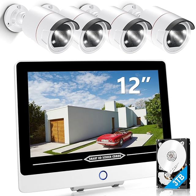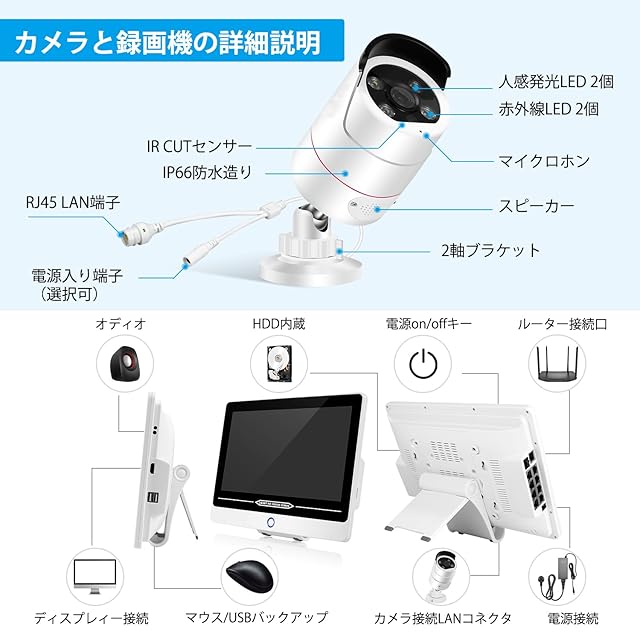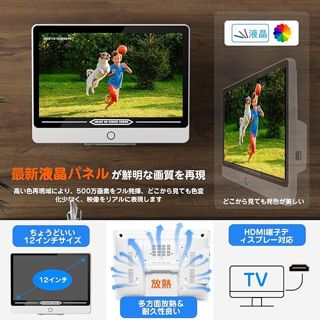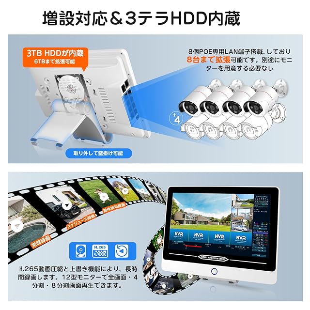 【12インチ一体型親機は外部ディスプレィー要らず】:親機は12インチ液晶モニターと親機が一体になって省スペース化、別途にモニター用意の手間がかかりません。HDMI端子が付いているため、大サイズの外部ディスプレイなどと接続可能です。防犯モニターは800万画素対応、発色が綺麗、5MP/8MPカメラも増設できます。裏面に広い面積で放熱して耐久性が優れています。POE防犯カメラ4台セットですが、8台まで増設、全画面/4分割/8分割画面で視聴・再生できます。ネットワーク環境があれば、スマートフォンやパソコンで遠隔監視出来ます。