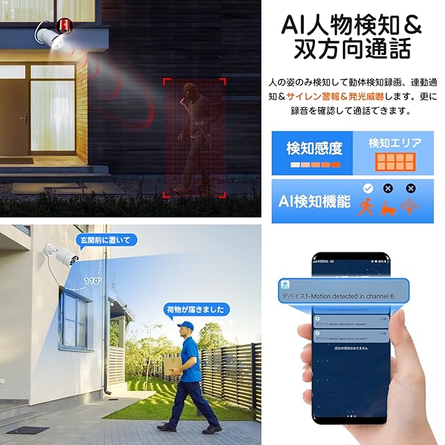 【防犯対策において機能面が充実】:AI人物検知機能が搭載、人の存在を検知すると親機ブザー、E-mail通知、アプリ連動通知が届きます。暗い環境の場合は明るいホワイトLEDで照らし、発光威嚇だけでなく不審者をカラー映像で特定します。また、POE監視カメラは大音量のサイレンが鳴って犯罪を抑止する効果があります。サイレン機能は自動/手動的に有効、若しくはOFFにすることができます。重要なエリアにアクティビティゾーンを設定して、より集中的に監視・防犯できます。