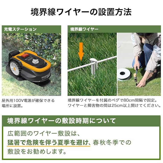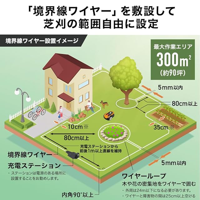 【境界線ワイヤーを敷設して、芝刈の範囲を自由に設定】芝刈範囲を「境界線ワイヤー」を敷設して決めることができるので、本体が芝刈エリアから出る心配はありません。