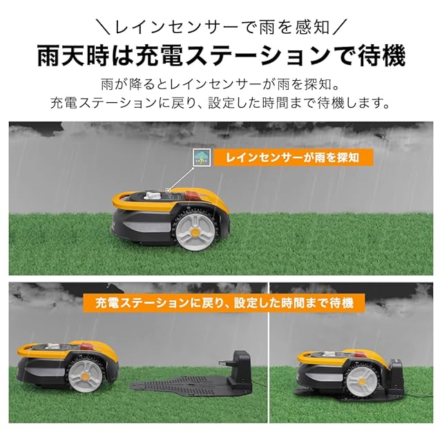 【レインセンサーで雨を感知!】雨天時は充電ステーションで待機します。持ち上げられたり傾けられたりすると自動で停止。障害物を探知すると方向転換します。