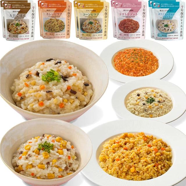 内容:・7年保存レトルトご飯 五目ご飯×2袋、コーンピラフ×2袋、カレーピラフ×2袋、トマトリゾット×2袋、ホワイトシチューリゾット×2袋・スプーン ×10本 内容量:1袋230g、スプーン(1袋に1本) サイズ:1袋160×190m