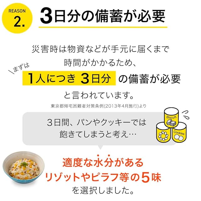 【東京都の条例で、災害時1人につき3日分の非常食が必要と言われているので、ウーマンジャパンが特別オーダーしたオリジナル・セットです】