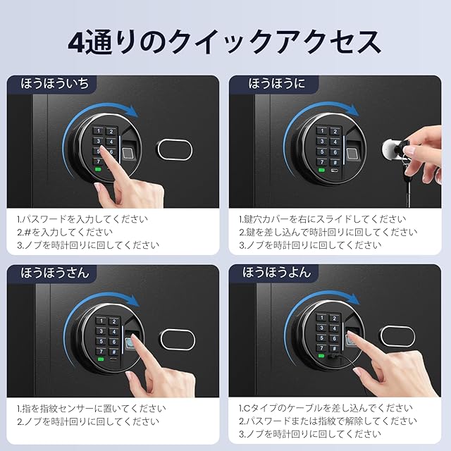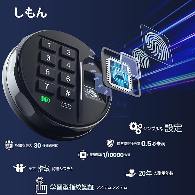 生体認証クイックアクセス機能: 高精度生体認証センサー搭載のホームセーフは、最大30件の指紋登録が可能。認証反応速度0.3秒未満の即応性で、初期設定必須の厳格なセキュリティ設計。家族の指紋を個別登録できる多人数対応仕様