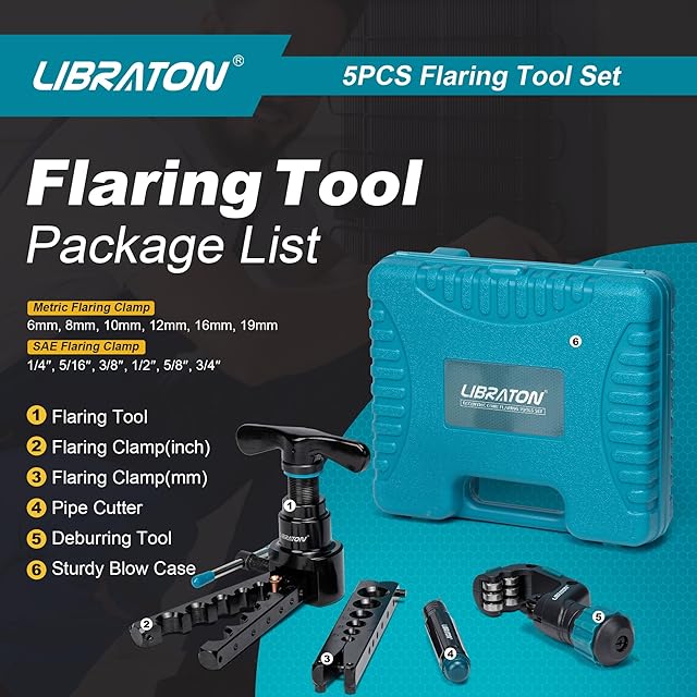 【5-in-1セット】このセットには、フレア工具、メートルサイズフレアクランプ、インチサイズフレアクランプ、パイプカッター(外径4mm~32mmのパイプ用)、バリ取り工具が含まれています。基本的なフレアリング工具がすべて含まれています。