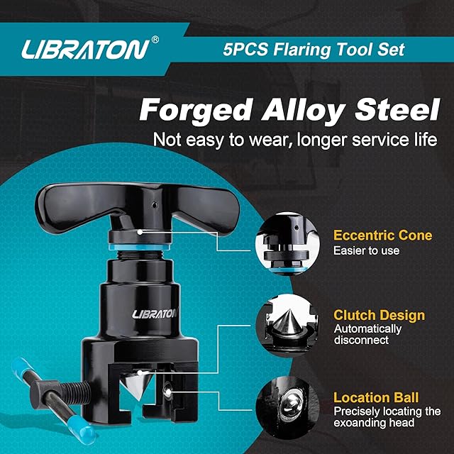 【フレアツール】Libraton偏心コーン型フレアリングツールセットには、外径1/4"、5/16"、3/8"、1/2"、5/8"、3/4"、外径6mm、8mm、10mm、12mm、16mm、19mmのパイプに対応するフレアクランプが2個付属しています。45°偏心コーン設計により、スムーズで高品質なフレアを簡単に作ることができます。(シングルフレア専用)