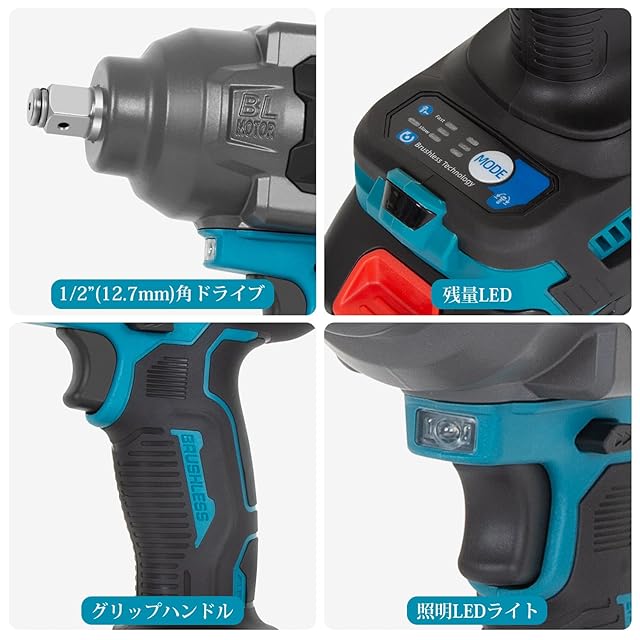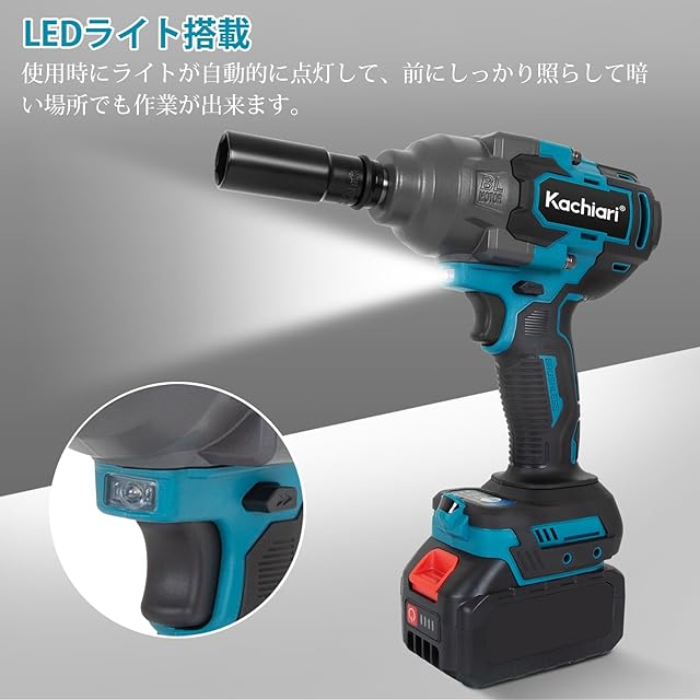 【LED照明機能&バッテリー残量LED付き】本機はLEDライト搭載、インパクトレンチを使用時に円形のライトが自動的に点灯して、前にしっかり照らしてくれるので、暗い場所でも作業が出来ます。また、残量LEDが3段階に表示され、電力状況が分かりやすいです。