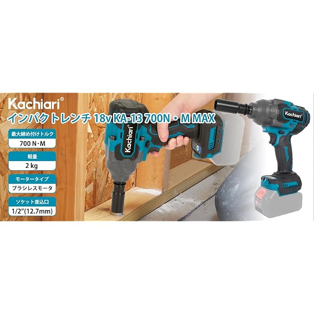 【充電式インパクトレンチKA-13の仕様:■型番:充電式インパクトレンチ KA-13 ■正逆・逆転・安全ロックレバー付き ■照明LED付き ■バッテリー残量LED付き ■最大トルク:700 N・M ■角ドライブ寸法:1/2”(12.7mm) ■無負荷回転数:0~3,200 min-1(回転/分) ■打撃数:0~3,800-min 1(回/分) ■ブラシレスモータ ■本体サイズ約 18*8*23 cm ■質量:約2 kg ■付属品:19MM 20MM 21MMソケット*1本ずつ ■生産国:中国
