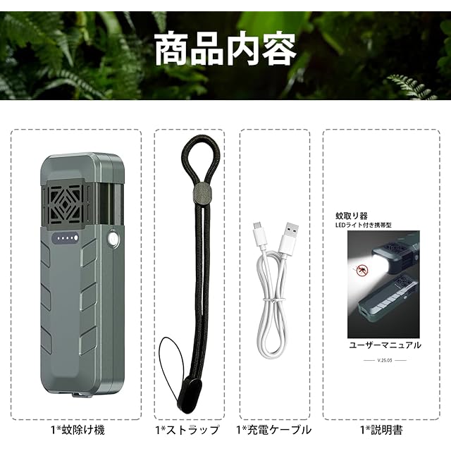 【梱包内容】ポータブルアウトドア蚊除け機、ストラップ、Type-C充電ケーブルと取扱説明書。蚊除け効果を維持するために、蚊除けマットの色が完全に白くなった場合(約4時間使用後)、交換が必要です。蚊除けマットのサイズは3.5×2×0.3cmです。購入した蚊除けマットが大きすぎる場合は、必要なサイズに切り詰めて使用できます。(ご注意:蚊よけマットはセットではないので別の店で購入する必要があります。)