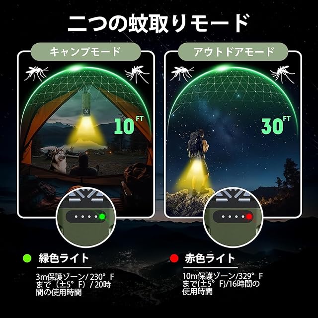【二重機能】さまざまな環境やニーズに対応するために、この蚊除け機には「アウトドアモード」と「キャンプモード」の2つのモードがあります。50秒で急速加熱し、保護されたエリアを作ります。キャンプモードでは満充電後、3mの保護範囲を20時間維持でき、アウトドアモードでは10mの保護範囲を16時間提供します。キャンプの設営でも、冒険に出かけるときでも、タイニーリペルはあなたのアウトドア活動の完璧なパートナーです!