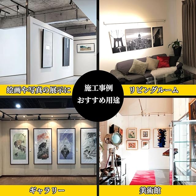 【どこでも取り付けOK】:自宅を簡単にギャラリーにかえることができるピクチャーレールです。掲示物の位置を簡単に調節できるだけでなく、透明ワイヤーで見ためがとてもスッキリ!シンプルなデザインでお部屋の雰囲気を損ないません。石膏ボートはもちろんのこと、コンクリート壁にもご使用いただけます。賃貸住宅に住んでいる方や、部屋をスタイリッシュに演出したい方に適しています。
