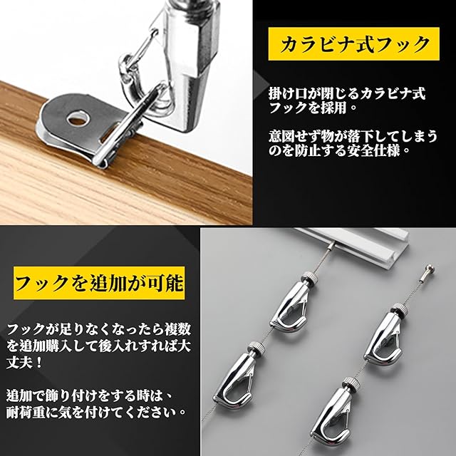 【フックの追加可能】:ワイヤーの端に付いた止め金具を取り外して(工具不要、力もいらず女性や子供でも5秒で取り出せます)、垂らしたワイヤーの下部から複数のフックを挿入するだけで、1本のワイヤーに複数のフックの追加が可能です。絵画やポスターのディスプレイはもちろん、壁面収納として活用可能で、洋服や小物の壁面収納など多様な用途に利用できます
