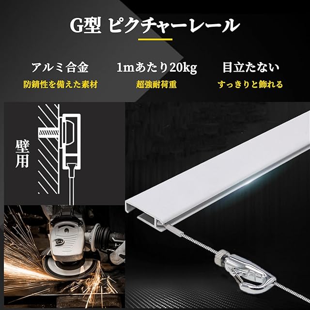 【セット内容】:G型ピクチャーレール(1m/本)*2本、ワイヤー(1m/本)*4本、フック*4個、エンドキャップ*4個、丸い留め具*7個、コンクリート壁用ネジ*7個、石膏ボード壁用ネジ*7個、コンクリート壁用パイプ*7個、石膏ボード壁用パイプ*7個、日本語説明書*1本。