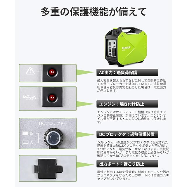 【多重保護装置により故障を防止】AC回路には電子ブレーカーが備え、DC回路にはサーキットプロテクタが搭載されています。過負荷運転や使用器具が異常を起こした場合は、電気出力が停止します。また、オイルが少ない場合に自動的にエンジンが停止するオイルアラート機構が内蔵され、エンジンオイルが不足し焼付きが起こることを防ぎます。※当社組立工場は本製品を組み立てた後、エンジン試運転を行い、異常がないことを確認します。試運転終了後はオイルとガソリンを抜き取りますが、少しのオイルとガソリンが残ることがあります。予めご承知ください。