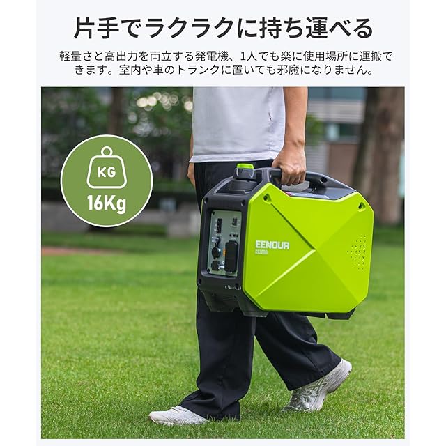 【軽量コンパクトで可搬性に優れ】多極オルタネータや小型OHVエンジンを搭載し、薄型リコイルや樹脂製カバーを採用することで、大幅な軽量化・コンパクト化を実現します。約16kgと軽量で片手で軽々と持ち運ぶことができます。 スクエアボディーに大型ハンドルを採用し、1人または2人でも楽に運搬できます。また、室内や車のトランクに置いても邪魔にならないコンパクトなサイズなので、室内保管や車積載もストレスなく行えます。