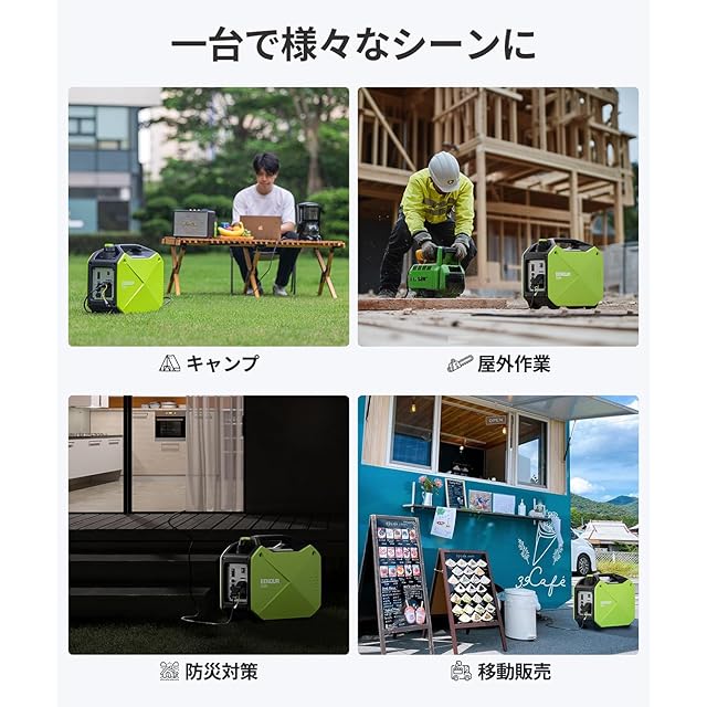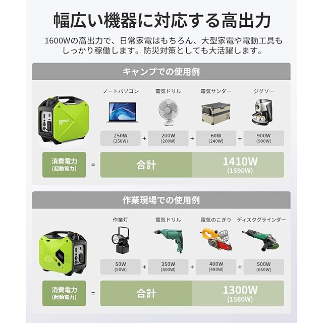 EENOUR インバーター発電機 GS2000i 定格出力1.6kVA 正弦波 防音型 PSE認証 高出力 静音 ガソリン ポータブル AC/DC/USB出力 50Hz/60Hz切替 過負荷保護 オイル不足警告 キャンプ DIY 移動販売 イベント 建設作業 災害時に大活躍