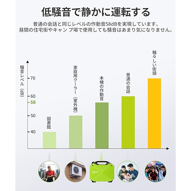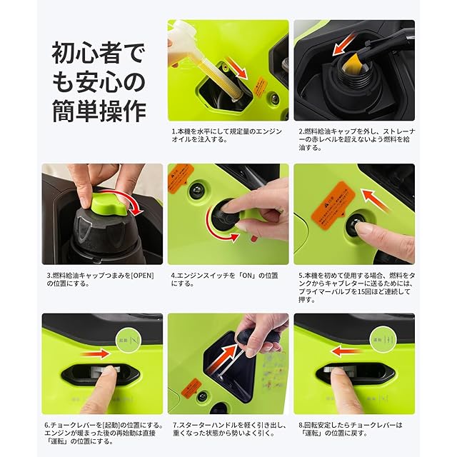 【超低騒音58dBで静かな作業】作動音の発生源であるエンジンを防音ポックスで覆い、外装ボディーも内部の音漏れを防ぐ作りとなっております。排気音を低減する大型サイレントマフラーも加えることで最小58dBと群を抜く静粛性を実現しています。普通の会話(58dB)とほぼ同じレベルなので、周りに迷惑をかけずに使用できます。※静かな夜間に使用する場合は作動音が大きく聞こえることがありますので、ご注意ください。