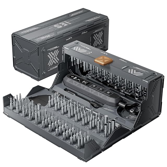【商品仕様】製品内容:収納ボックス*1、電動ドライバー*1、ESDピンセット*2、バール*2、三角オープナー*10、エクステンションバー*1、サクションカップ*1、USB-C ケーブル*1、162PCSビット。製品重量:1050g ;電動ドライバー重量:67g。