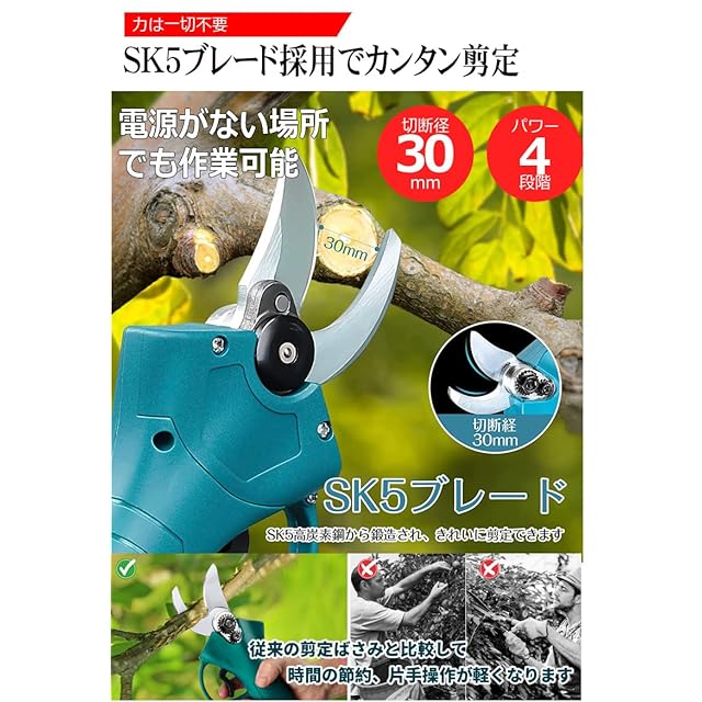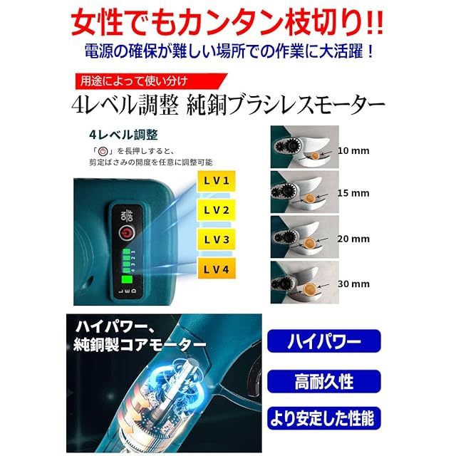 高耐久 ハイパワーモーター搭載 4レベル調整可能 3cm の 太い枝 も力不要で 簡単 に 切断