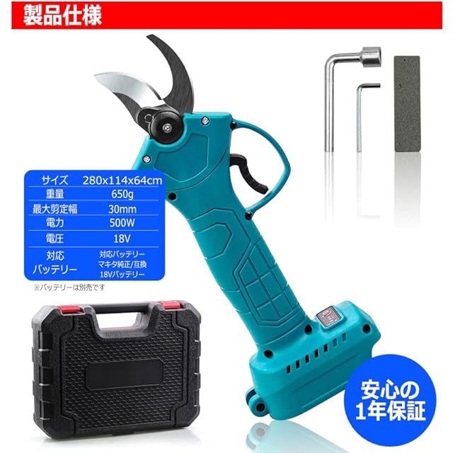 ● マキタ 18V バッテリー がそのまま使用できる! <br> 電源の確保が難しい場所での作業に大活躍 <br> <br> ● 高耐久 ハイパワーモーター搭載 <br> 4レベル調整可能 3cm の 太い枝 も力不要で 簡単 に 切断 <br> <br> ● SK5ブレード 採用 で 切れ味 抜群<br> 今まで 力を入れて 切っていた枝も レバーを引くだけ!<br><br> サイズ:280x114x64cm<br> 重量:650g<br> 最大剪定幅 :30mm <br> 付属品 本体 ケース ブレード ネジレンチ 2個 研石 収納ケース 日本語説明書<br> 対応バッテリー <br> マキタバッテリー18V スライド式リチウムイオンバッテリに対応 <br> BL1830 BL1840 BL1850 BL1860 BL1830B BL1840B BL1850B BL1860B など <br> (14VタイプやBL1815Gなどライトバッテリーや旧型には対応しておりません。バッテリーは別売です) <br> <br>