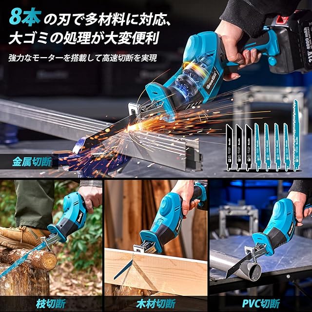【強力モーター搭載!高速切断で効率抜群】当社の電動ノコギリは、強力なモーターを採用し、従来品より切断スピードが約 20%向上しました。回転数 3000RPM で、無段変速機能も搭載しており、切断材料に合わせてスピードを調整でき、効率的な切断を実現。木材(約 150mm)、竹(約 100mm)、金属(約 2mm)、プラスチック製品(約 100mm)などを簡単に切断可能です。そして、アップグレードされた充電式レシプロソーは、高効率、低消費、安定性と低騒音という魅力を兼ね備えています。お使いいただくと、作業がスムーズに進み、大変便利ですよ。ぜひお試しください!安全面では安全ロックボタンが装備され誤操作を防ぎ、起動には両ボタンを同時押しが必要です。