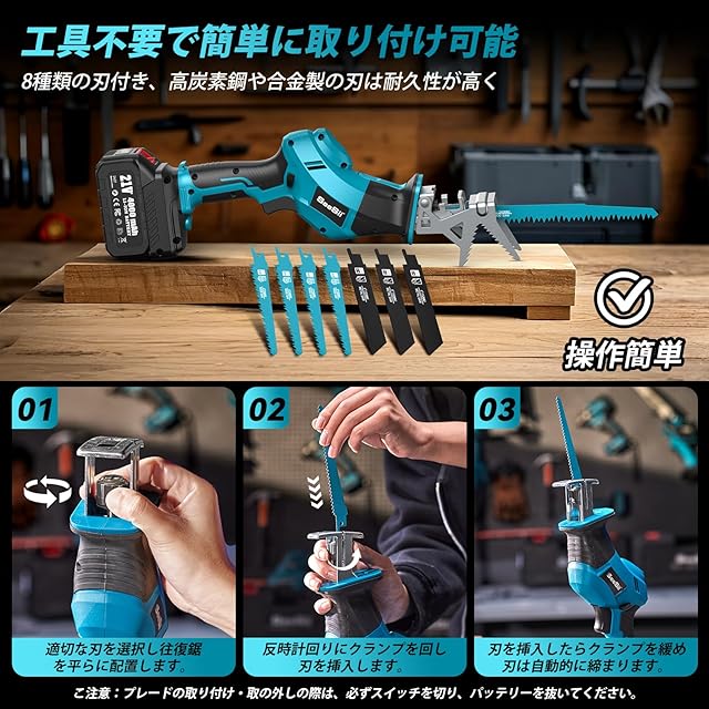 【1台2役】高枝切りには延長ポール付きで、高所の枝も簡単に切断できます。そして、延長ポールを外すだけで、手持ち用の電動ノコギリとなり、低い木を切断することができます。または、木工用と鋼鉄用のブレードを2種類(計8本)用意しておりますので、庭木の枝打ち、枝の剪定、木材や金属、プラスチック製パイプなどの切断、さらに粗大ゴミ解体にも、この1台で十分です。ブレードの交換が工具不要で楽々!刃の取り付けと取り外しが素早くできます。従来の高枝チェーンソーより、当社の電動ノコギリの切断面が美しく、滑らかで、樹木にも優しい!