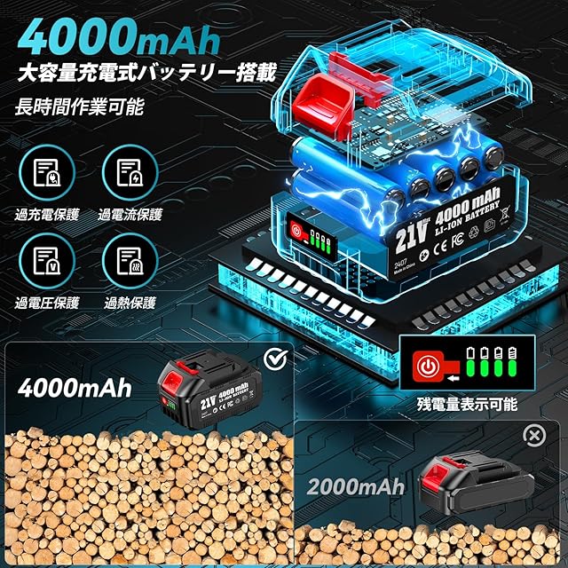 【4000mAhのバッテリー】大容量の4000mAh のバッテリーにより、長時間の作業にも対応することができます。また、電池残量表示が付いており、電力状況が一目で分かることができます。それに、この商品の本体はマキタ 18V リチウムイオンバッテリー(BL1820b、BL1830b、BL1840b、BL1850b、BL1860b)にも対応することができます。