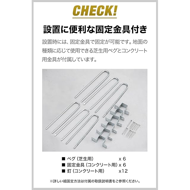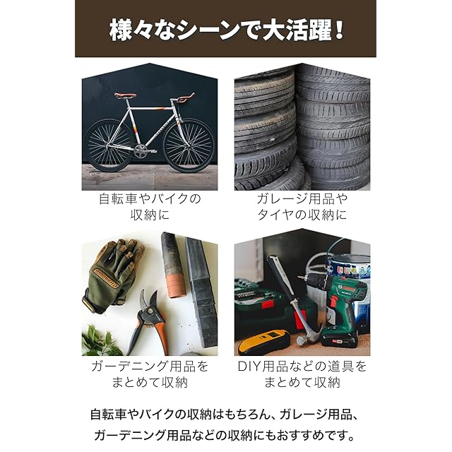 ✅【設置に便利な固定金具付き】地面の種類に応じて使用できる芝生用ペグとコンクリート用金具が付属しています。✅【様々なシーンで大活躍】自転車、バイクの収納はもちろん、簡易的な物置としてガレージ用品や冬用タイヤ、ガーデニング用品・DIY工具、子供の遊具などの収納にもオススメです。